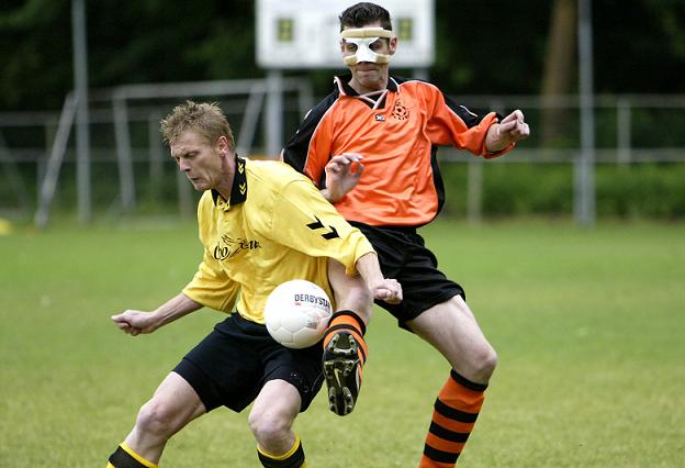 Gebroken neus of niet, Ronald Voorhorst verdedigde met masker de kleuren van de CJV'ers. Foto: Ronald Hissink