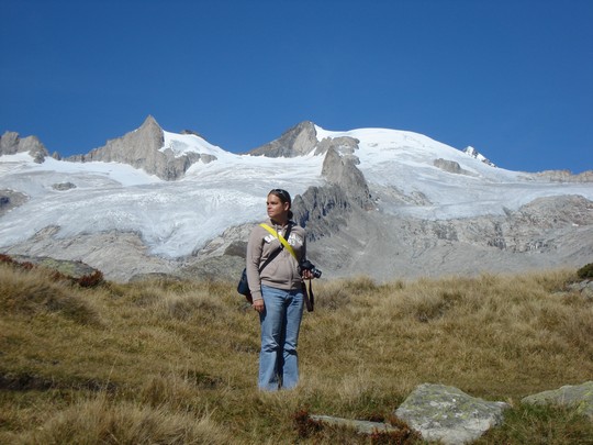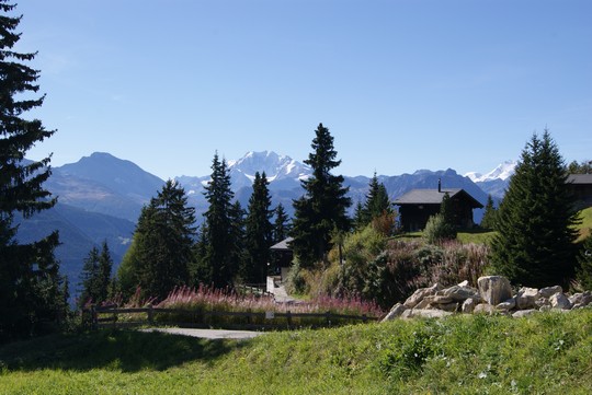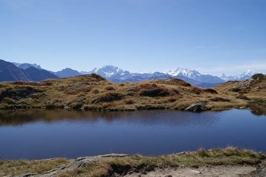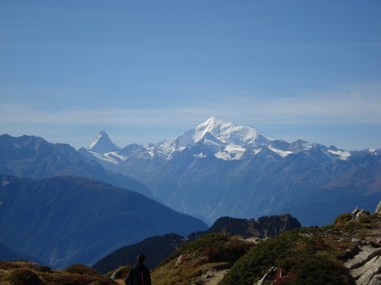 Als we de andere kant opkijken zien we in de verte nog 2 heel bekende bergen, de Matterhorn (links) en de Weisshorn (de grote brede witte punt) |