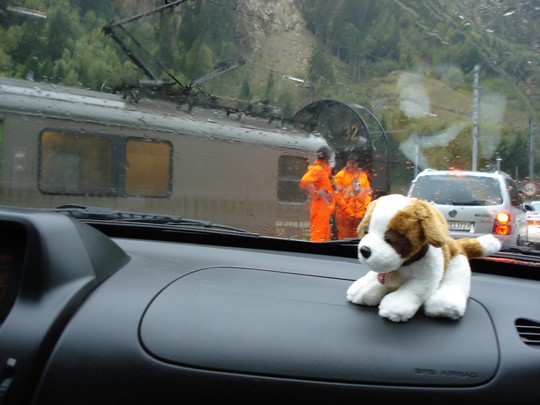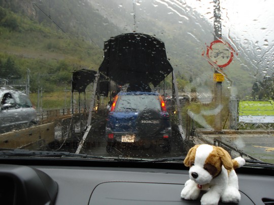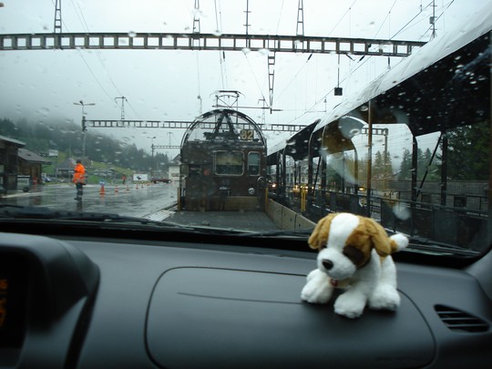 Vandaag was het weer echt slecht (werd de auto weer mooi schoon, die wasbeurt was wel nodig na die droge periode). Op weg naar huis kwamen we op de snelweg vlak na Sion al bordjes tegen dat de Furkapass en de Nufenenpass gesloten zijn vanwege sneeuwval. We hebben dus bijzonder veel geluk gehad met het weer te afgelopen 2 weken. We hebben overal waar we waren lekker in de zon kunnen lopen. Op de terugweg hebben we niet echt bijzondere foto's meer kunnen maken. We hebben alleen nog enkele foto's van de autotrein in Goppenstein.Hier rijden we naar de trein op |