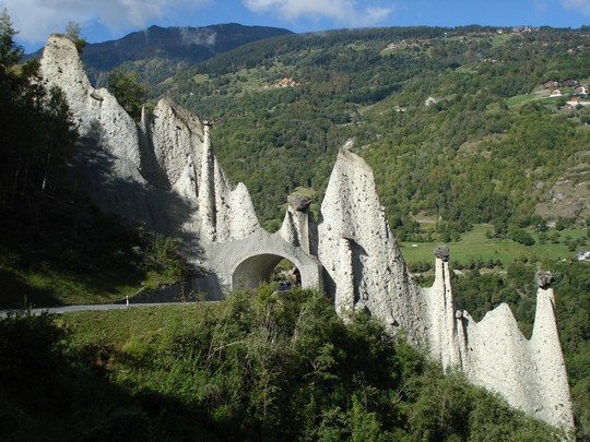 Op deze dag zijn we in de auto gestapt op zoek naar de Pyramides van Euseigne. Je komt er vanuit Sion al vrij snel langs als je de zijvallei Val d'Hérens binnen rijdt. De piramides zijn net iets meer dan 20 m hoog. Ze zijn ontstaan door erosie van het gesteente. De kei boven op de piramide verhindert dat de regen het (zachtere) gesteente daaronder wegspoelt.Zo zien ze er uit |