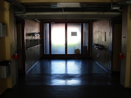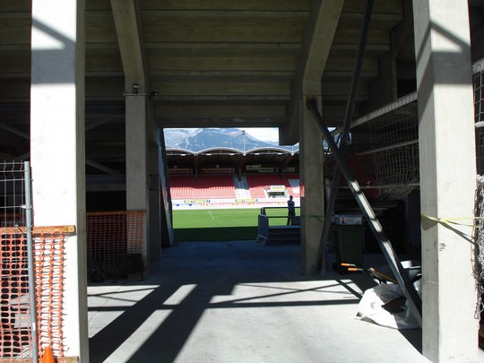 Op de terugweg kwamen bordjes tegen met een symbool van een voetbal, die zijn we gevolgt en kwamen bij het stadion van FC Sion. Er was niemand die ons te woord wilde staan dus we hebben onszelf een kleine rondleiding gegeven. Totdat de matriaalman ons vertelde dat we de 23e terug moesten komen om FC Sion te zien spelen.De buitenkant van het stadion |