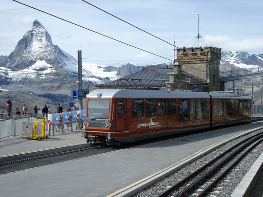 Dit is het speciale tandradtreintje voor de steile rit van het Zermatt naar de Gornergrat. Net toen wij in wilden stappen was er een storing voor onbepaalde tijd, die na ruim een uur wachten verholpen bleek te zijn. Waarna we onze reis toch nog konden vervolgen. |