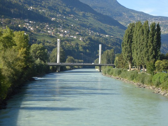 Dus maar lopend de Rhone over in de richting van het centrum van Sion. Onderweg besluiten we toch maar geen auto te huren en op de trein te stappen naar Matigny. Inclusief de voor de avond geplande busreis van Sion naar Veysonnaz waarschijnlijk goedkoper dan een auto huren. We hebben gelukkig voor de zekerheid maar even gevraagd hoelaat de laatste bus naar boven zou rijden van Sion na Veysonnaz. En dat was helaas al aan het begin van de avond. |