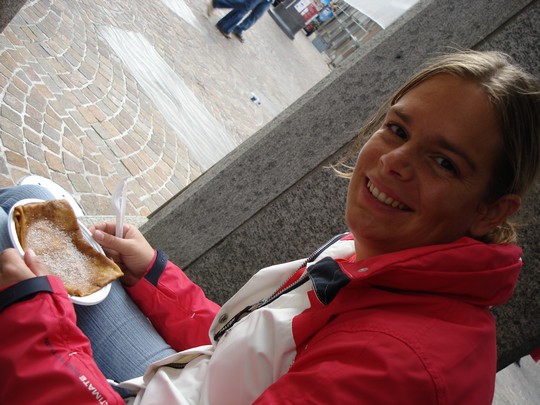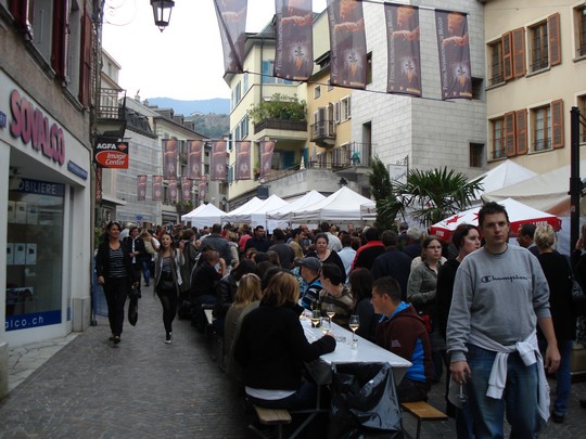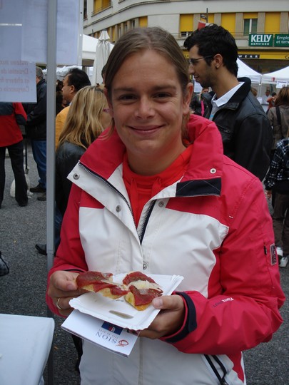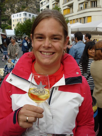 In Sion aangekomen, bleken ze daar vandaag het jaarlijkse wijnfeest te hebben. Je koopt een glas voor 3 franc, die je als je naar huis gaat weer in mag ruilen voor 2,50 of mag houden. Wij hebben ze dus gehouden als aandenken. Overal in de stad stonden partytenten waar je je glas voor 5 franc met wijn kan laten vullen. Bij iedere tent kon je ook wat lekkers kopen, zoals te zien is op de onderstaande foto's.Zo ziet het glas eruit |