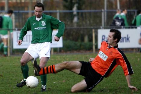 Jeroen Kuijper zet een sliding in op SVVN voetballer Kay Poppe. De CJVers won het spectaculaire duel met 4-3. foto Ronald Hissink