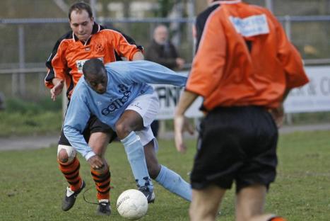 Robert Slinkman van De CJV'ers (links) onderging drie zware knieoperaties. Met een ingepakt gewricht - en een losse veter - probeert hij SVI'er Manwell Saro de bal te ontfutselen.foto Ronald Hissink