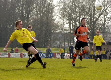 Bas Tieman van De CJV'ers (rechts) komt te laat om een voorzet van OZC-speler Leon Makkinga te onderscheppen. foto Fotobureau Uijlenbroek