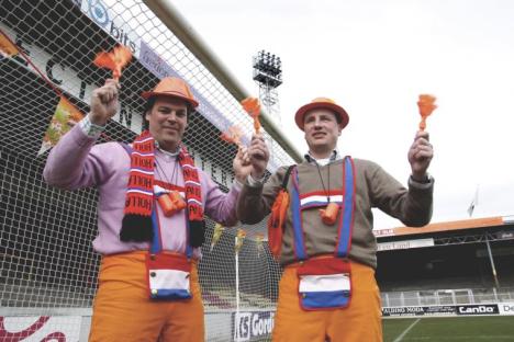 De Oranje Tas is - in tegenstelling tot veel andere producten bij Goal Promotions - vooral business to business: de minimumafname is vijftig stuks. Een beetje Oranje-straat zou ook nog geďnteresseerd kunnen zijn. Hoe groter de afname, hoe goedkoper de stukprijs. "De Alpenhoorn hebben we trouwens zelf geďmporteerd." Alpenhoorn?"Ja probeer maar." De relatief kleine toeter laat het lege stadion galmen. "Geluidje, hč?