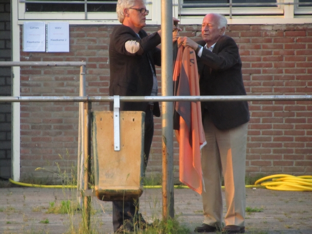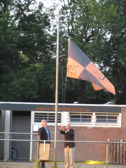 Het voor de laatste maal strijken van de CJV’ers-vlag door de voorzitter en de erevoorzitter: