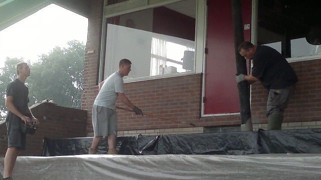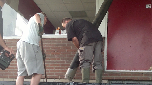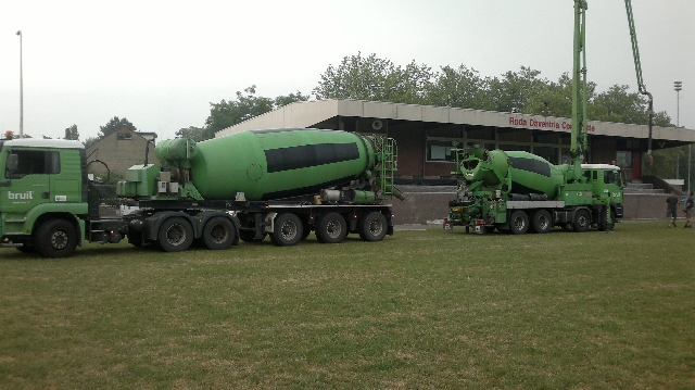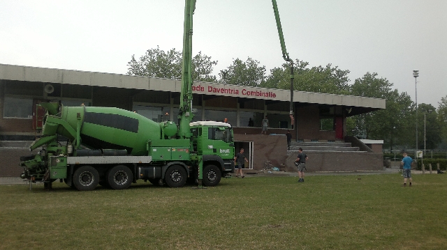 We schrijven donderdag 20 juni 07:00 uur 's ochtends. Na vele weken voorbereiding is het eindelijk zover. Het beton kan worden gestort. Een select groepje vrijwilligers is de afgelopen weken dagelijks van 's ochtends vroeg tot diep in de middag druk bezig geweest met het gereed maken van de tribune.